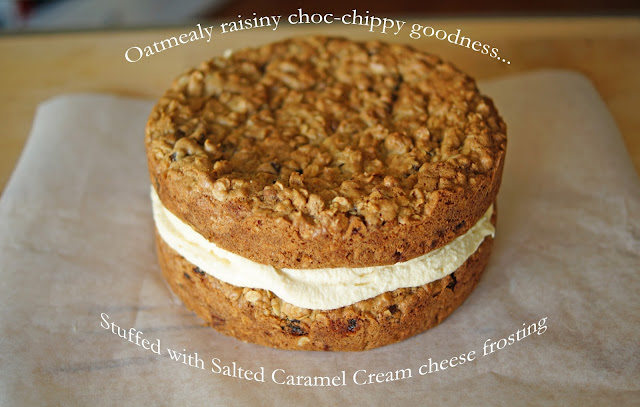 Giant Oatmeal, Raisin & Chocolate Chip cookie sandwich filled with Salted Caramel Cream cheese frosting
